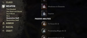 - Tri-Focus – Attack with an effect based on the destruction staff you have equipped (Fire reduces enemy spell resistance for 6 seconds, Frost snares enemy by 30% for 3.5 seconds, and Lightning deals 5% splash damage to two nearby enemies).